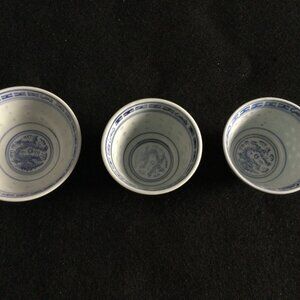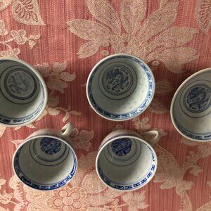 Lot of 5 Vintage Chinese rice eyes grain translucent dragon pattern cups & bowl