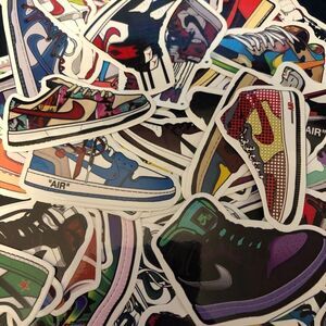 Hey there! Please look at all of the photos, as we have thousands of vinyl Sneaker stickers in many different styles and this is an assorted lot of 50 stickers.