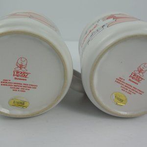 The stoneware mugs are 3.5 inches high and 3 inches in diameter. They are dated 1984 and were made in Korea.