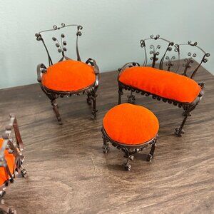 Lot of 8 Vintage Tin Can Scroll Tramp Art with Orange Stuffed Velvet Seats Table