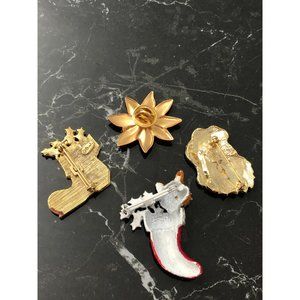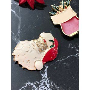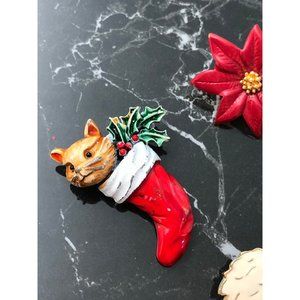 Cute Assortment of Christmas Holiday Brooches/Pins. Enamelled Christmas/Holiday Stocking with Holly, marked B.J. Measures 1.25" by 1.50", Kitten in a Stocking measures 1.75" length by 1.25" width at widest point.Red Poinsettia measures 1.25" and Santa Head 1.50" by 1". In good condition. No returns or exchanges.