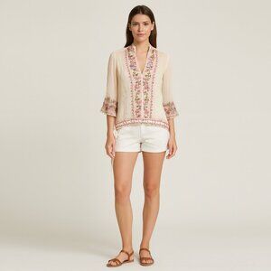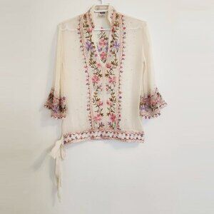 Lotta Stensson Silk Embroidered Beaded Tunic White V Neck Side Tie Top