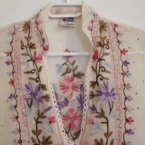 Made from 100% pure silk, this piece boasts intricate embroidered threadwork and delicate beading that adorns the neckline and center front. Its open V-neck, three-quarter sleeves and bow tie side. The beauty of this piece extends to its back, where you'll find stunning beading and embroidery. This top was made in India.