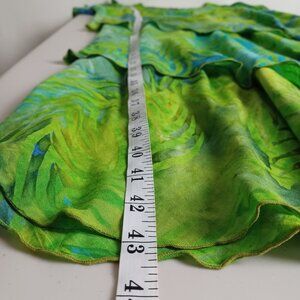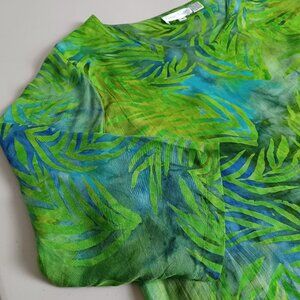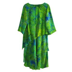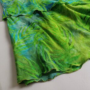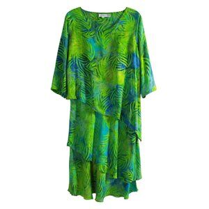 A tropical-inspired dress in watercolour shades of green, yellow and blue, accented with palm prints throughout. The material is lightweight, flowy, and has no stretch. It’s a relaxed fit and falls to knee length. Perfect for summer. Great condition.