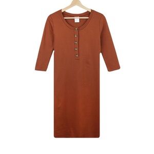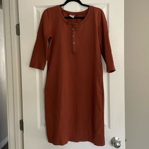 Lou Lou & Company Every Day Maternity and Nursing Dress in rust. These dresses are amazing for maternity and breastfeeding with their zipper for easy access. This dress is missing the top button.
