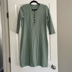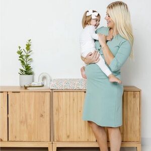 Lou Lou and Company Every Day Maternity and Nursing Dress in mint. PLEASE READ CAREFULLY. This is labelled as a size Medium. However, we are quite convinced it is a SMALL that is mislabelled. I own quite a few of these dresses and in comparing it to my other mediums it is smaller in the shoulder width and hips than the other mediums I have listed. I have included some photos to illustrate this in comparison with the same dress in black that is a true medium. The fabric of this dress is also not the quality of the fabric of the other exact same dresses that I own. This dress fabric has pilling, the others do not. I have priced this dress lower to account for these defects.