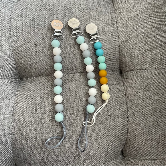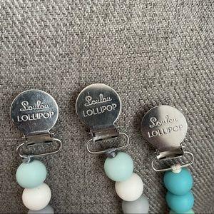 Bundle of 3 Loulou Lollipop pacifier teether clips. Used with one child. Perfect for keeping baby’s pacifier or toy off the ground! Features a plastic insert to protect fabric, food grade silicone beads for teething and rust-resistant stainless steel clip. Good used condition.