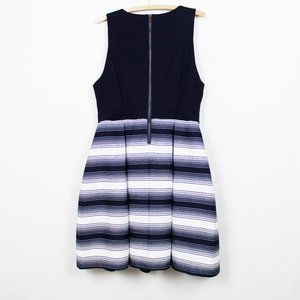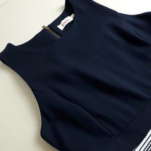 Inspired by the 1950’s, a bouffant style dress in a navy blue shade accented with pleats and stripes. The fabric is heavyweight and has some stretch that will give you a flexible and tailored fit. Comes with a zip up closure on the back for easy slip on and off. Makes an excellent, versatile choice that suits numerous occasions and is an absolute lifesaver for those last minute party invitations. Great condition.