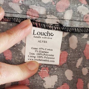 Super chic mini skirt from British brand Louche London. Features a fun and modern polka dot print in navy, red and white. Modern striped trim with cute bow on front. Has pockets. Unlined. Zips up the back with exposed silver zipper. UK 14, which is a US 10.