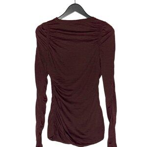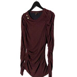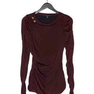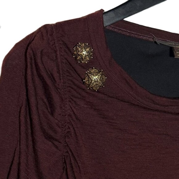 Louis Vuitton 2010 Burgundy Star Button Accents Top. From the 2010 collection. Burgundy wool blend with a soft modal lining. Features a round neckline, ruched detailing along the sleeves and sides, and two (2) engraved branded star-shaped antique gold-tone buttons at the left shoulder. Long sleeves. Slim fit. Made in Italy.