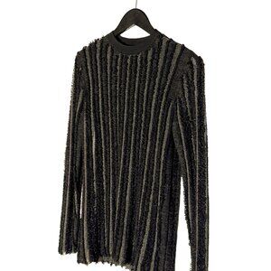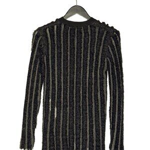 Long sleeve design with vertical textured wool knit fringe stripes in black and grey tones. Sheer mesh base with semi-transparent effect. Crew neckline in black. Slim fit. Made in Italy.