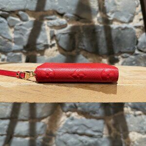 Textured Monogram Empreinte red leather with embossed LV motifs. Zip-around closure with branded gold-tone hardware and long leather pull tab. Interior with slip compartment, two (2) sections, card slots, and coin pocket. Made in France. Comes with a Louis Vuitton dustbag.