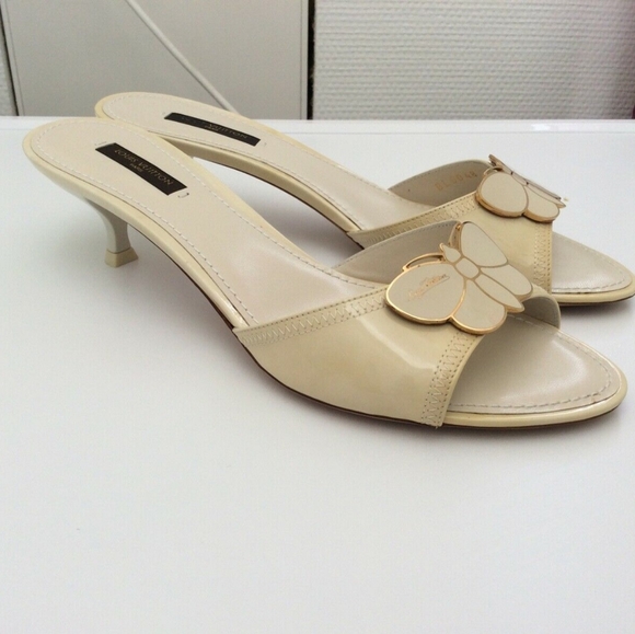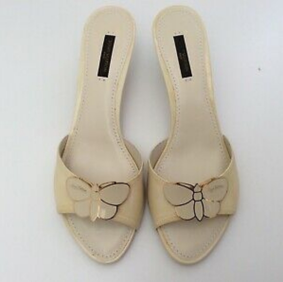 Pretty Louis Vuitton mules, size 38.5. new never worn but with flaws (discoloration of the off-white patent leather in some places and presence of stains next to the butterflies) everything is in photos. Small heel 5.5cm high. Very beautiful butterfly decoration which gives charm