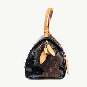 Composition: Coated canvas, leather trim, sequins, velvet, textile lining, metal hardware.