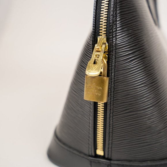 This LV tote was designed in the 1930s by Gaston Vuitton. These Alma bags are a classic of the Maison and crafted in France. This bag features an unconventional, but stylish zipper that starts at the base of the bag and extends across the top. The interior was made with grey Alcantara suede and it has a small slip pocket. As well as two black handles, brass feet, and a brass zipper ring.