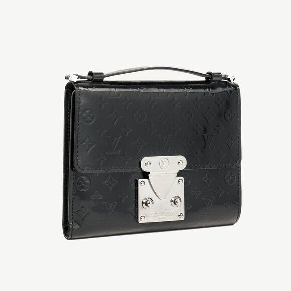 Circa 2001, the Anouchka PM wallet from Louis Vuitton is crafted in a glossy black Mini Monogram Glace leather, and features silver-tone hardware, a top handle, a front flap secured with a push clasp, a tonal leather lined interior, a flat pocket, 3 card slots, a pocket mirror, and a sleeve with an envelope pouch.