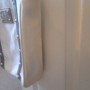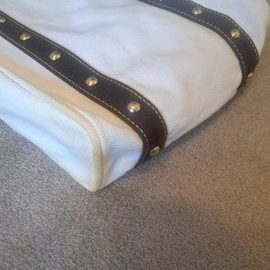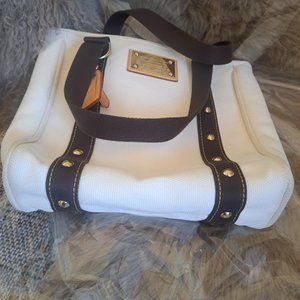 Louis Vuitton "Antigua Cabas MM" tote bag, in creme canvas, with brass hardware, tan Vachetta leather trim, dual brown canvas shoulder straps, striped twill lining, dual slip pockets at interior walls, zip closure at top;
