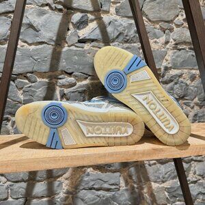 Low-top silhouette in white tones of leather, suede, and textile combo. Embellished with clear, grey, azure blue and deep blue crystals. Side LV wave logo. Padded tongue with LV logo. Lace-up closure. Ribbed mid-panel. Light blue heel counter with LV branding. Semi-translucent rubber outsole with VUITTON signature. Removable white textile insole. Made in Italy. Come with Louis Vuitton box and dustbags.