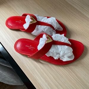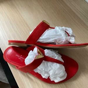 Louis Vuitton Bahiana Flat soft Red Suede Sandal with Gold V logo size 36 good condition . Casual dressy and classy summer sandal .