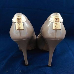 Gold-tone hardware LV padlock accessorizes the back of the pumps