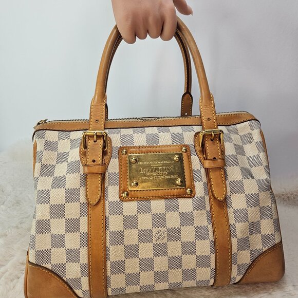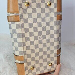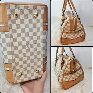 Damier Azur coated canvas, natural cowhide leather trim, and gold-tone hardware.