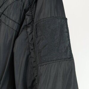 Circa 2007, this puffer jacket from Louis Vuitton is crafted in a black nylon, and is adorned with an embroidered logo patch on the left sleeve. It features long sleeves, ribbed-knit cuffs, a collared neckline, a front zip closure, an elasticized drawcord waist with an elasticized buckled belt, front zip and snap-closure pockets, real goose feather insulation, and is lined in a monogram-jacquard satin.