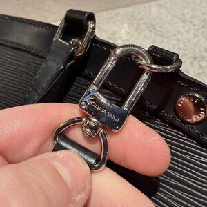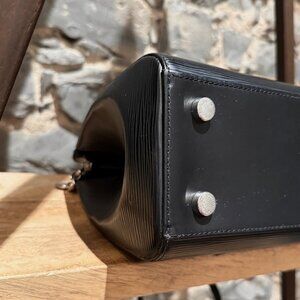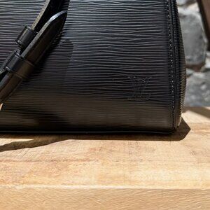 From the 2015 collection. Structured silhouette in black Epi leather with smooth leather trim. Embossed LV logo on the front lower corner. Dual rolled leather top handles. Branded silver-tone hardware including hanging charm as a zipper pull. Detachable and adjustable leather shoulder strap with buckle and clasps. Top zipper closure. Protective metal feet at the base. Interior in black textile with dual slip pockets and a zipped pocket. Made in France. Comes with a Louis Vuitton dustbag.