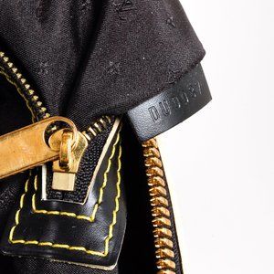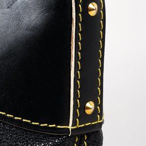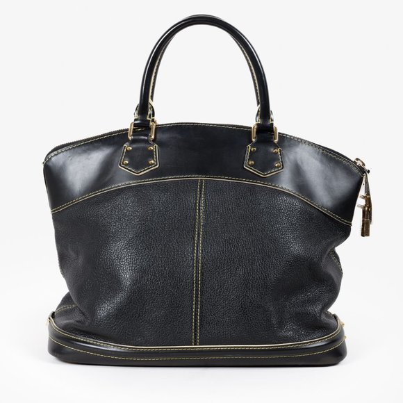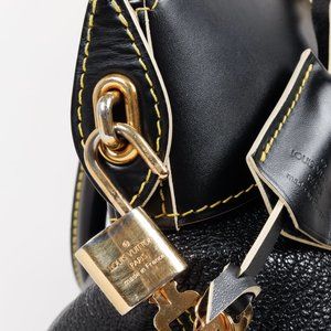 This vintage Louis Vuitton Suhali Lockit bag is crafted from grained suhali goatskin leather with tonal box calf trims, yellow topstitching, gold-tone hardware, and white painted edges. This handbag features a pair of rolled leather handles, a structured base with protective metal studs, a leather clochette with keys, two metal studs on each side, and a top zip closure that opens to a spacious jacquard-lined interior with two flat pockets and a zip pocket. A signature LV lock dangles from a side.
