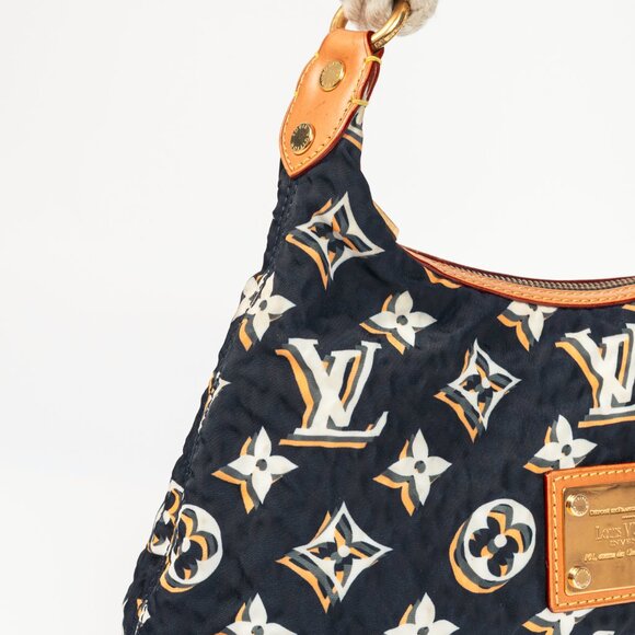 Made in Italy, this Bulles PM bag from Louis Vuitton circa 2010 is crafted with a crinkled navy textile in the designer's iconic Monogram, and features natural cowhide leather trim, gold-tone hardware, a rope shoulder strap with a hook closure on one side, an engraved front logo plate, pleated corners, a top zip closure, a white textile-lined interior, and a slip pocket.
