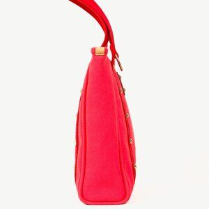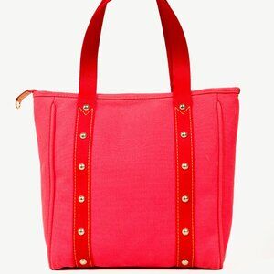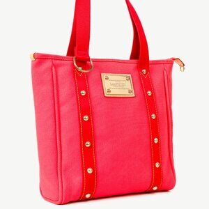 Named for a Caribbean island famous for its yachting races, the nautical Cabas MM tote from Louis Vuitton circa 2005 is crafted with the designer's Antigua canvas in a bright Rose pink, and features natural cowhide-leather trim, gold-tone hardware, two contrasting red webbed shoulder straps with an attached D-ring, studded rivet embellishments, and an engraved nameplate on the front. The top zip closure opens to a red and white striped textile-lined interior containing a cellphone pocket, and a patch pocket.
