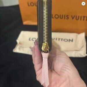 Chic Authentic Louis Vuitton wallet with a pink zipper pull. Features a brown exterior with gold zipper.