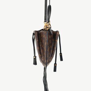 Made in Italy, this bohemian Fringed Noe bag from Louis Vuitton's 2017 Cruise collection is crafted in the designer's brown Monogram Canvas, and is elevated with long fringe hanging down from the base. It features contrasting black leather trim, gold-tone hardware, contrast edge dying, a removable top handle, a removable shoulder strap, pleated compartments with a double-faced tassel drawstring closure, black microfiber lining, an interior slip pocket, and a zipped central compartment in smooth calfskin.