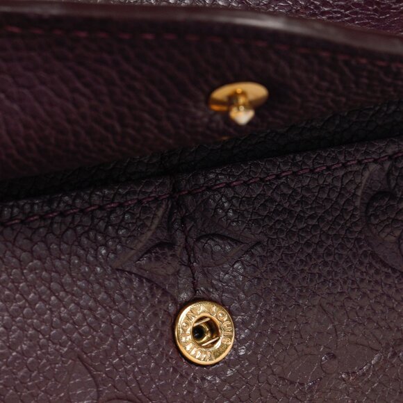 The Curieuse wallet from Louis Vuitton is crafted with a monogram Empreinte leather in an Aurore purple, and features gold-tone hardware, a front flap with a snap closure, 8 card slots, a gusseted compartment, and a bill slot.