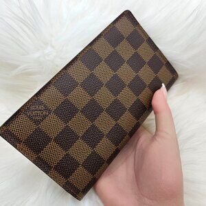 Damier Ebene coated canvas sleek bifold wallet with multiple card slots, bill compartments.