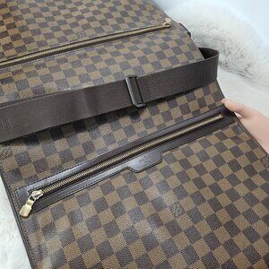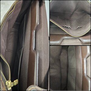 Crafted from the signature brown Damier Ebene coated canvas with dark brown leather trim and gold-tone hardware, it combines style and functionality.