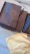 Elegant Louis Vuitton clutch with iconic checkered pattern. Features rich brown tones. Ideal for stylish outings.