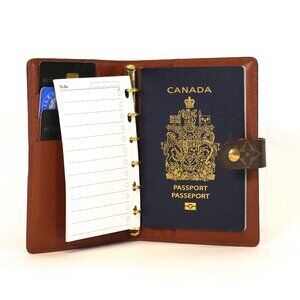 This is a practical and stylish Louis Vuitton accessory that will help you stay organized. This agenda features an exterior of durable Louis Vuitton Damier Ebene coated canvas that is held by a snap closure. It opens to an interior of terracotta cross-grained leather with three card slots and two large pockets. The agenda has a brass 6 small ring binder that holds inserts. Perfect for daily agenda or air travel!