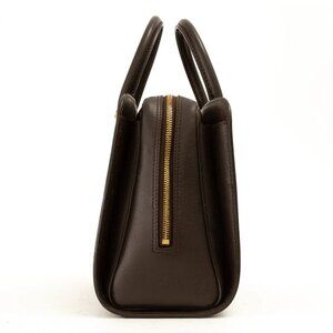 This compact handbag is crafted of signature Damier coated canvas in brown, with dark brown rolled leather top handles and matching cross-grain leather sides. The bag features a full gusseted pocket on either side and brass wrap-around zippers that open to a burnt orange microfiber interior with a zipper pocket. This is a versatile handbag with the classic appeal of Louis Vuitton!