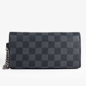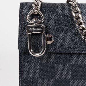 The Louis Vuitton Damier Graphite Chain Wallet is a sleek and sophisticated accessory that effortlessly combines style and functionality. Crafted from the brand's iconic Damier Graphite canvas, this wallet exudes understated luxury. The compact design features multiple card slots, a zipped coin pocket, and a secure chain for versatile carrying options. Perfect for the modern individual on the go, this chain wallet from Louis Vuitton is a timeless piece that adds an elegant touch to any ensemble.