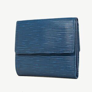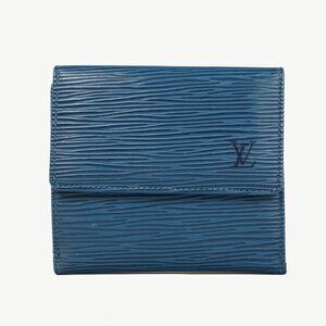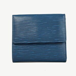 The Elise wallet from Louis Vuitton is crafted with the designer's Epi leather in a Myrtille blue, and features a snap-closure flap on both sides with an embossed logo on one, an accordion change compartment, 4 card slots, 2 flat pockets, and one long pocket.