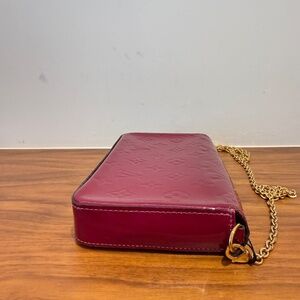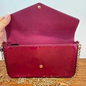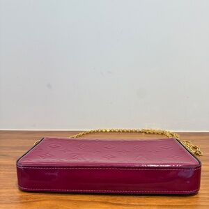 This is an authentic LOUIS VUITTON Empreinte Pochette Felicie Chain Wallet in Dark Raspberry Red. This stylish wallet is crafted of Louis Vuitton monogram-embossed Empreinte patent leather. This stylish shoulder bag features an envelope-style facing flap, an optional gold chain strap, and a crossover flap with a matching button snap. This opens to a red fabric interior with a patch pocket.