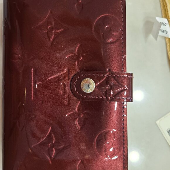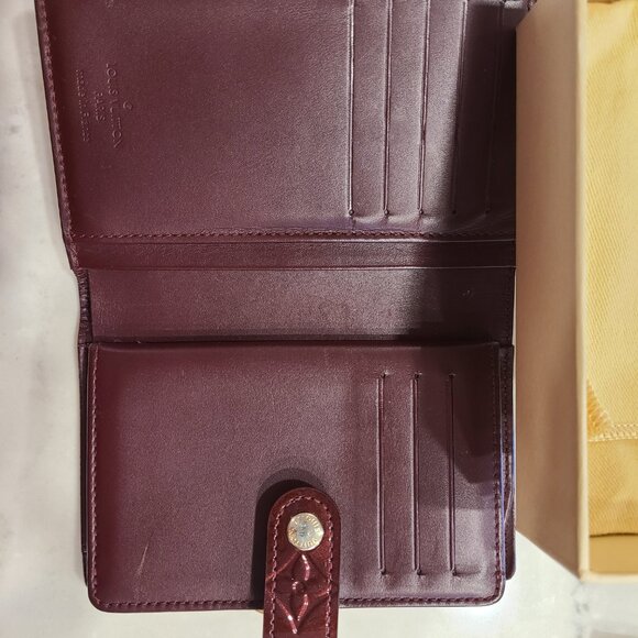This compact wallet from Louis Vuitton is crafted with the designer's Vernis Monogram leather in an Amarante color, and features a snap closure compartment, eight interior card slots, bill compartment, and a change purse compartment with a clasp closure.