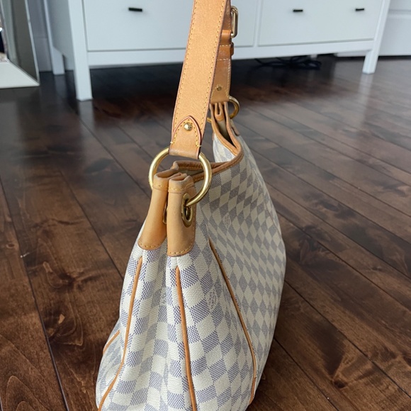 Beautiful spacious and trendy Louis Vuitton Damier Azur Galleria. Coated canvas and piping in near perfect condition with no notable defects. Please inspect photos. Highlights * ivory white/navy blue/camel-coloured * leather * signature Damier Azur canvas * gold-tone logo plaque * concealed magnetic fastening * adjustable top handle * internal patch pockets * internal logo patch * suede lining * gold-tone hardware SIZE AND FIT 15"W x 10.5"H x 5"D 8.0" handle drop