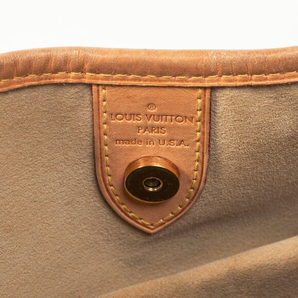 Made in the U.S.A., this Galleria PM hobo from Louis Vuitton circa 2009 is crafted in the designer's Damier Azur canvas, and features natural cowhide leather trim, shiny golden brass hardware, an adjustable belted shoulder strap with logo-engraved ring attachments, leather piping on the front and back, protective metal feet on the flat canvas base, and a Louis Vuitton Inventeur plate on the front. The top magnetic snap closure opens to a beige microfiber-lined interior containing a snapped flap pocket, a gusseted pocket, and a D-ring.