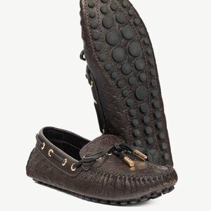 Made in Italy, these loafers from Louis Vuitton circa 2012 are crafted with a brown pebbled leather in an embossed Monogram pattern, and features closed rounded toes, whipstitched detailing, front bows with engraved lace tips, leather lining and soles, and flat pebbled rubber outsoles.