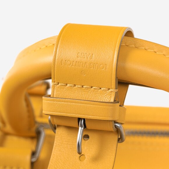 Travel in style with the Louis Vuitton Keepall Bandouliere 45. This elegant travel bag boasts a vibrant yellow leather exterior with the iconic Damier pattern. It offers multiple carry options, including a removable, adjustable shoulder strap and double rolled top handles. With a spacious interior and convenient organization features, this bag is perfect for all your travel needs.