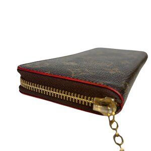This wallet is crafted of traditional monogram toile canvas. The wallet features a cherry red resin trim and a polished brass 3/4 wrap-around zipper with a flower charm zipper pull. The zipper opens to an interior of cherry red cross-grain leather with card slots, bill pockets, and a central zipper currency compartment.