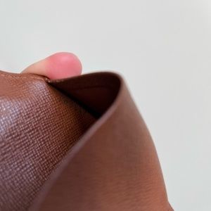 This mini agenda cover from Louis Vuitton is made from the brand’s iconic monogram canvas, and features tonal painted edges, a foldover strap with a snap closure; and a brown cowhide leather-lined interior containing three slotted compartments, and a branded stamp.