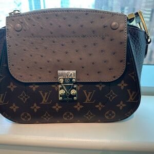 Unique LV Monogram Majestueux Collection Shoulder Bag, featuring Lizard, grosgrain, python and ostrich leather besides the stereotypical monogram canvas. The shoulder strap is crafted from natural lizard leather, the interior strap and flaps in ostrich leather while the lining is made of goat leather. The bag features two outer pockets with brass metallic S-lock closure. Excellent condition.