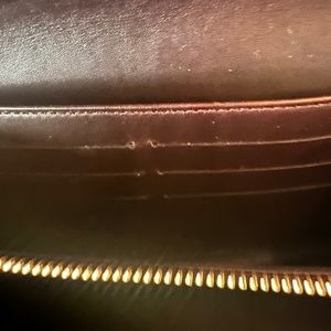LV luxurious Amante Monogram patent leather long wallet. Opens with a button LV embossed button to an interior of matte deep burgundy leather with one center zipper coins compartment, two separate opening sections, bills section, and one section for six cards. Additional card slots in the exterior section, under the button closure. Preloved, hand carried or stowed inside the purse (separate listing), faint wear and overall condition is excellent. See my other listing for the matching purse. H: 9.5cm, W: 2cm and L: 19cm. Made in France.